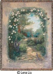 A peaceful garden scene with "Come with me to a quiet place" Mark 6:31 Image on throw ©Lena Liu