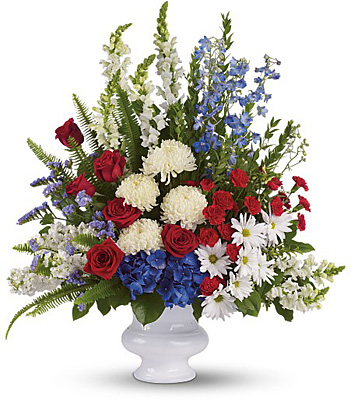 A dazzling display of patriotic red, white and blue flowers sends a silent yet poignant statement about hope, freedom and the strength to endure. This proud bouquet is a testament to life that is sure to be appreciated.