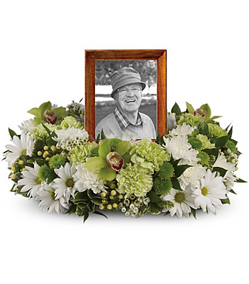 An exquisite round wreath with blooms inspired by the lasting impressions a loved one makes on our lives. Surround a treasured photograph, poem or other dear memento with sweet, green carnations, white and green chrysanthemums and the special beauty of green cymbidium orchids.