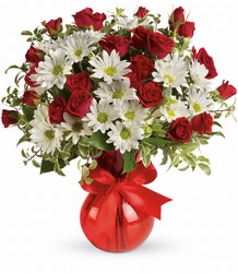 Celebrate your love with flying colors! Little red roses and classic white daisies make this sweet bouquet a favorite for Valentine's Day, birthdays and more. Delivered in a shapely red vase and tied with a shimmering red ribbon, it's a gift from the heart. Approx. 13 1/2 W x 14 3/4 H